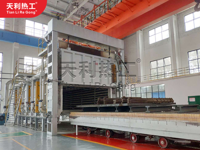 **,臺車爐設備的爐底是可以移動的臺車,工件進行加熱前,臺車在爐外裝料,加熱時則有牽引機構將臺車拉入爐內,工件加熱后則由牽引機構將臺車拉出爐外進行卸料,同時,該設備的爐溫可以按照工藝要求在爐內完成一個完整的加熱周期,爐溫是比較高的,并且加熱工藝可在較大范圍內進行任意調整。